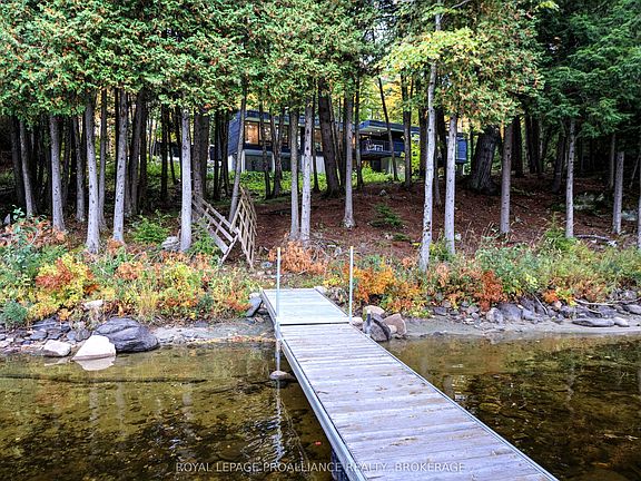 Stunning year-round home in a private and densely wooded setting located on Kennebec Lake. This modern and exceptional home sits on 2.8 acres of dramatic topography with trees, rocks and a gentle slope down to the waterfront with north-westerly views. The shoreline has a gradual entry into the water with a sandy bottom and is deep at the end of the dock for great swimming. The home was built in 2021 and attention to detail is seen throughout the house and outbuildings. Built on the lakeside of a rock ledge, the home has a partially exposed lower level with a level walkout. The main floor features a central common space containing the entry foyer, living room, kitchen and dining areas with the three bedrooms on this level located on either end of this space. The woodstove in the living room provides a warm and inviting atmosphere. There is a large deck that overlooks the lake with an amazing, covered barbecue station in the centre. The lower level features a spacious recreation room, bedroom, bathroom and utility area and a door leads to the lakeside yard. The house is clad in ship-lap western red cedar siding and has been designed with superior energy performance criteria with exceptionally high R-values for the standing seam roof, wall, and slab assemblies and airtightness considerations with the windows and doors Alumilex high-performance triple-glazed aluminum with argon filled IGU units with Dbl- low-E coatings. The 2-car detached garage sits up on the hill behind the house as well as a one-bedroom bunkie for extra guests. No expense has been spared with the design and build of this home. Kennebec Lake is a deep, clean lake located in Central Frontenac Township with easy access from Hwy 7. Fish species in the lake include walleye, pike and bass as well as various pan fish. Located approximately 3 hours from Toronto or 1.5 hours from Ottawa.