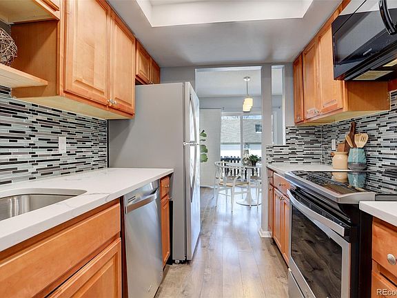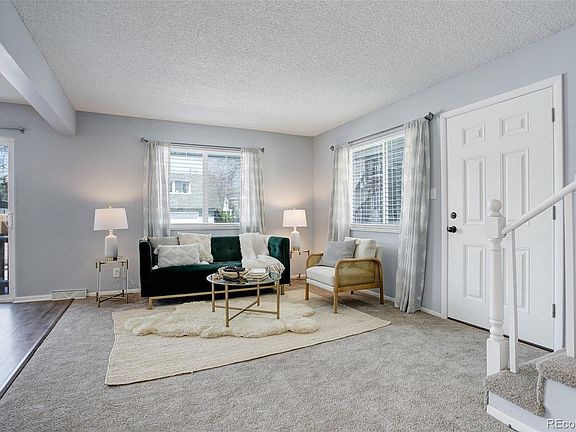 Beautiful move in ready townhome surrounded by mature trees in a fantastic central location! Enjoy entertaining with an open floor plan on the main level with amazing natural light, a great room that opens to the dining space, sliding doors to the patio and a main level 1/2 bathroom. Gorgeous kitchen featuring stainless steel appliances, quartz countertops, backsplash, modern cabinets and laminate floors that flow to the dining area. Upstairs offers 2 bedrooms with abundant closet space and a full bathroom. Excellent flex space in the finished basement that would work perfectly for an office, movie room or workout area. Washer and Dryer included and there is a large storage area in the basement that has potential to become an additional bathroom. Step outside and enjoy your morning coffee and breakfast on the private, fenced patio just off the dining area. Across the street is a beautiful park and there are many walking paths throughout the well maintained community along with a pool to enjoy during the summer months. 1 Car detached garage is just steps away from the unit. Recent updates include: Windows | Water Heater | Central Air | Carpet | Paint | Lighting. Convenient location only 15 minutes to Cherry Creek and DTC, or hop on the Cherry Creek Bike Trail that's just around the corner. Easy access to highways, restaurants, shopping and public transportation...simply a great place to call home!