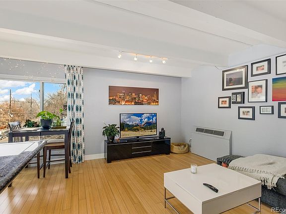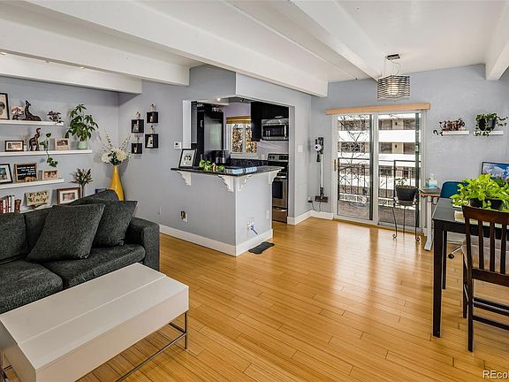 Natural light abounds at this updated corner condo in the heart of Cheesman Park! Beautiful bamboo flooring runs throughout the modern open concept floorplan that is accented by exposed beams, neutral paint, and frosted glass interior doors. The private covered balcony is the perfect place to enjoy your morning coffee or an after work cocktail while taking in the views of the historic neighborhood. The renovated kitchen delights with a breakfast bar, granite countertops, stainless steel appliances, and Ikea cabinetry. Designed with entertaining in mind, there is a matching wet bar with the same finishes. The floorplan is completed by a sizable bedroom with 2 closets and a stylish updated full bathroom complete with lovely tile work. Forget the nightmares of street parking, a deeded parking spot in the underground garage is also included! The Parkville Condos building has undergone thoughtful updates and features great community amenities including an indoor pool, fitness center, sauna, and storage. Live in one of Denver's best neighborhoods; this gem is located just 2 blocks from famed Cheesman Park and is also blocks away from Congress Park, the Denver Botanic Gardens, and all of the restaurants, coffee shops, comedy clubs, shopping, and entertainment options found on vibrant Colfax. Walk Score of 82 and Bike Score of 85!