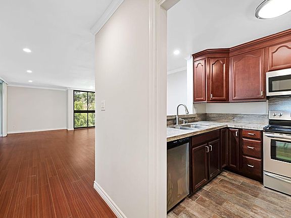 Bright and clean top floor corner unit with a nice size balcony in a security building with recessed lighting, wood flooring, crown molding, dishwasher, refrigerator, and parking in a secured garage. Common area laundry room, gym, swimming pool and community room. Water is paid for. Tenant is responsible for electricity. No smoking. No pets.