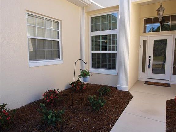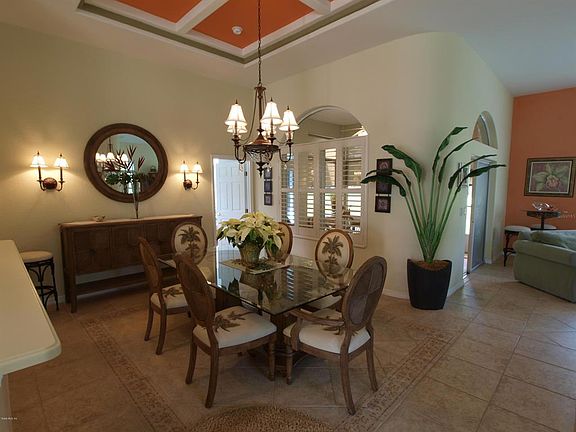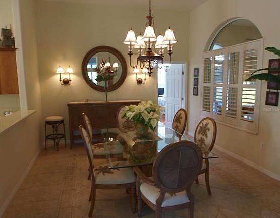 This home is formerly builders model and has the upgrades you've been wishing for. Beautiful open-concept Tahiti model home. Fantastic condition, features high ceilings, dining room with coffered ceiling and designer tile. Den features built in office area and cabinets with murphy bed for those extra guests. Eat-in kitchen, upgraded maple cabinets with pull out drawer for ease in storage. Spacious lanai with or without AC and heat. Master bedroom has added space with sitting room plus spacious walk in closet. Master bath has tiled shower and one of a kind sinks. All this overlooking private yard on the golf course.