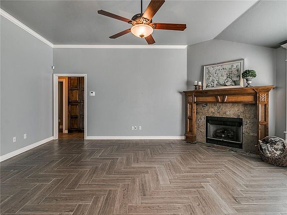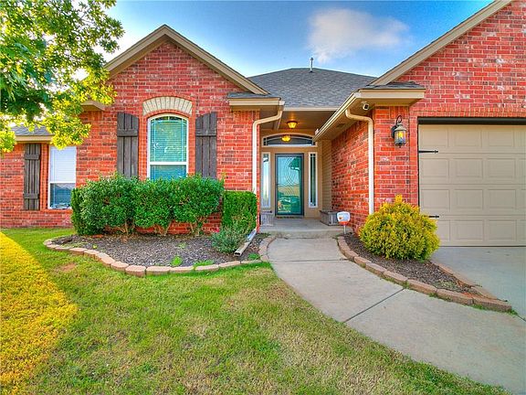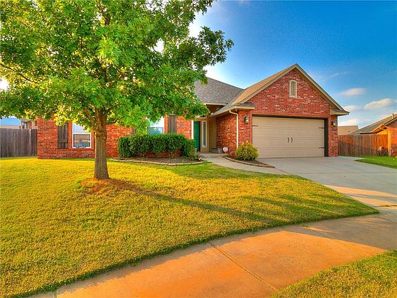 Lovely home on an oversized lot tucked back into a cul-de-sac! Features include beautiful herringbone-patterned wood-look tile in living, gas log corner fireplace, bamboo engineered hardwood in all bedrooms, granite counters, stainless appliances, tumbled marble shower and jetted tub. LARGE backyard and covered patio. *NEIGHBORHOOD POOL* Super quick I-40 and Kilpatrick Turnpike access, close to new shopping/restaurant development at I-40 and Czech Hall. All of this in the Mustang School District!!