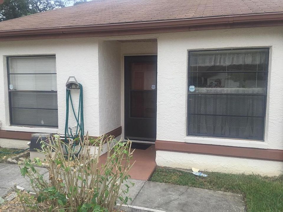 Conveniently located Villa in a quiet little 55+ community with community pool, shuffleboard and recreation room. Low monthly fees of $103.00 include upkeep of pool, common areas, exterior landscaping irrigation, fertilization & pest control & exterior painting. This villa is move-in ready with brand new stainless steel appliances, tiled floors in baths & kitchen, high quality laminate floors in living, dining, hall & guest bedroom, new carpet in master bedroom and Florida room. A 1 car garage has a workbench area. A small pet is allowed. Nice private back yard area and a gate to access the church at the rear. This one will not last so take a look now before it is gone.