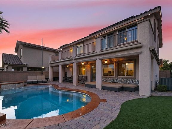 Stunning golf-course home in a premier 24/7 guard-gated community on a quiet cul-de-sac. Upgraded 4-bedroom + loft, 3-bath home sits on Hole 3-Chimera Golf Course & offers beautiful golf, mountain, wetlands & Strip views(2nd level). Interior features wood-look tile flooring, plantation shutters & an open great-room layout. Gourmet kitchen includes white cabinetry, large island, granite counters, single-basin sink, SS appliances& a walk-in pantry. Primary suite offers a full-length balcony w/ views. Oversized secondary bedrooms, one downstairs w/a full bath. Backyard features over $50K in commercial-grade retractable awnings, pebble-tech pool w/waterfall and spa, house lighting, fans, pavers & high-end synthetic cooling turf. Additional upgrades:epoxy garage flooring, tankless water heater, whole-house H2O filtration unit, EV charger & battery backup system for the solar. Tuscany community features include multiple pools, tennis courts, pickleball courts, fitness center & more.