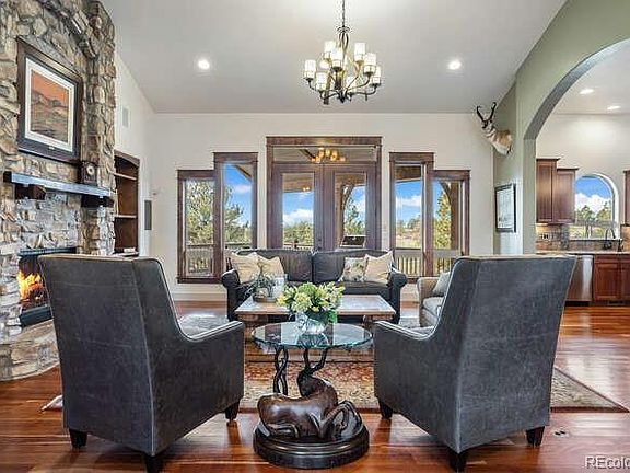 Located in the sought-after Bell Cross Ranch neighborhood, this gorgeous custom walk-out ranch style home sits up on 2.5 Acres with mountain views from the entire west side of the house. Obvious custom craftsmanship resonates throughout this home. The lofted great room with stone fireplace and large gourmet double island kitchen open to a spacious covered deck. The elegant formal dining room with Butler's pantry is perfect for entertaining. This 5-bedroom home has a gorgeous primary bedroom with fireplace opening to the deck on the main floor with an additional bedroom and private study also on the main floor. The walkout lower level has a huge recreation area with wet bar, theatre area with raised seating, (media equipment and seating included), fireplace, and 3 large bedrooms with 2 bathrooms as well as multiple storage areas. Professionally landscaped with towering pines, full basketball court, sand filled play area and water feature that tumbles down the slope under an arched bridge flowing into a beautiful stone pond that can double as a wading area. The lower level has a large flagstone patio with outdoor kitchen and firepit area. Large 3 car garage. This home truly has it ALL and is a MUST SEE. So close to the vibrant town of Parker.