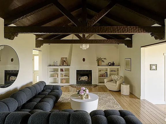 At the heart of the home, a dramatic living room showcases a pristine Bow Truss ceiling and an original fireplace both striking architectural centerpieces that speak to the home's storied past.