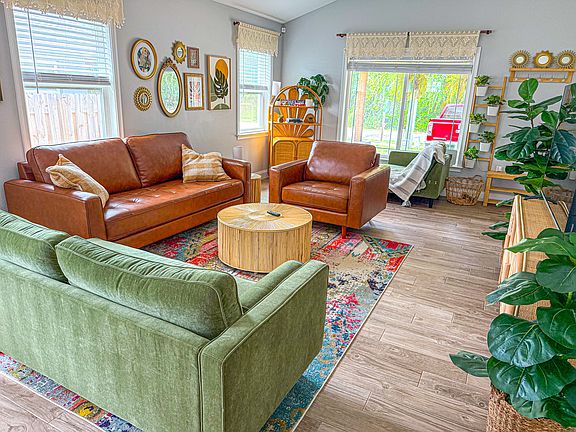Available 12/1! Short term lease 1-5 months. Pets welcome! Perfect for snow birds looking for a quiet and peaceful place! Cozy 3BR/2BA boho bungalow FULLY FURNISHED with brand new everything. 1 mile from the Rainbow River in Dunnellon, FL. Each bedroom has a new queen bed, plus a fully equipped kitchen, large living area, and 2 full baths. Relax on the spacious front porch with coffee or enjoy the backyard which has a grill. Board games and cards provided. Walking distance to kayak rentals, 1 mile to Swampy's Waterfront Restaurant and Blue Run Park. Minutes to KP Hole Park and Rainbow Springs State Park. Float down the river, enjoy the peace and quiet, hike and bike!
