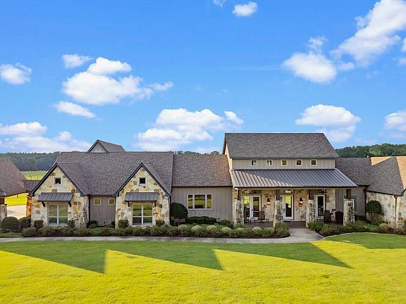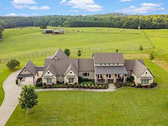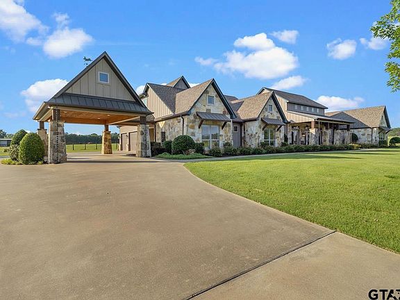Welcome to "The Surf Farm," a luxurious and peaceful 55-acre estate that combines relaxed charm with modern comforts minutes from Tyler. The main house features a great room with soaring ceilings and an impressive fireplace, creating an inviting space for relaxation and socializing. The chef’s kitchen is equipped with a large island, two sinks, a six-burner gas stove, double ovens, dual wine grottoes, full-size refrigerator and freezer, and a spacious pantry with electricity for small appliances. The primary suite boasts a cathedral ceiling, views out the front and back, a Victoria and Albert bathtub, and his and her’s closets. Additional accommodations include two guest bedrooms with ensuite baths and an upstairs area with another bedroom, bath, and a media/game room. For entertaining, the property offers seamless indoor and outdoor spaces, including two large media ready patios; the back one equipped with an outdoor kitchen (gas grill, Green Egg and sink) that provides stunning views of the grazing cows and expansive fields. Practical features include an oversized utility room and full bath both with backyard access, a whole-house generator, a safe room, and spray foam insulation for year-round comfort and security. The farm also caters to livestock needs with cross-fenced pastures, covered corrals, washing and drying stations, a large hay barn and an office. The Surf Farm is a sanctuary offering a serene and luxurious lifestyle amidst nature, perfect for both relaxation and entertaining.