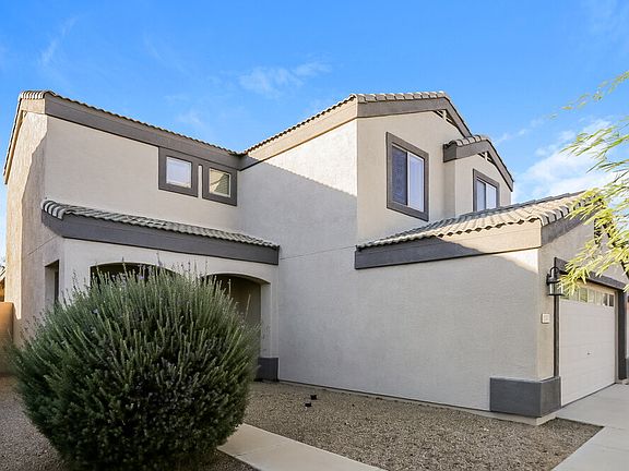 Come see this pet-friendly rental home with two stories and an attached garage in El Mirage, AZ. The home's 1,495-square-foot layout includes four bedrooms and two and a half bathrooms. You'll love the living room's modern vinyl plank flooring and the open layout that merges with the dining area. Open up the sliding glass doors to step outside to the back patio. Head into the kitchen to find a full set of stainless steel appliances and long white quartz countertops. Next to the huge corner pantry, there's a door that opens onto the laundry room. The main bedroom is on the second floor. It has a double-door entry, a private bathroom, and lots of storage space in its walk-in closet. Don't wait to apply for your tour!