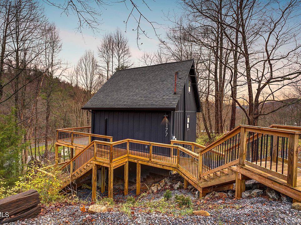 Step onto the wrap around deck of this A-frame Chalet and take in this gorgeous, characteristic, and completely newly renovated almost half an acre property tucked away in this quiet yet local, charming Erwin neighborhood! 3 stories, 2 large bedrooms, 2 full bathrooms, 1,200 sqft of charm, New roof, New gutters, New double pane windows, Electric gas, and new Hardi Plank Composition siding. Whether you're looking to purchase your next hit Airbnb spot or simply wanting to find the next home for you and your loved ones, consider taking a tour of this special one today! As you step inside through your french doors, your main level hosts your modern open galley kitchen with butcher block countertops, stainless steel appliances, and a modern tile backsplash, the dining space and living area, all with new LVP flooring. The upper level accommodates one of the huge bedroom spaces with natural light pouring in, comfortably fitting a twin, a twin on rollers and a queen bed with built in shelving all around, a storage closet, and a linen closet. New carpet upstairs. A full bath is also upstairs with a beautiful tiled shower and LVP flooring. Heading to the lowest level is your Primary suite which currently fits a California king bed. You also have all new carpet downstairs and private, walk out deck access to enjoy your scenic property. Your ensuite bath is just around the corner with more updated tile flooring, a beautiful tile shower, soapstone countertops, new double vanity, a great size closet for linens and storage plus washer and dryer hookups. There is a mini-split on each level for everyone's temperature needs. Relax on your new deck while overlooking the serene landscape on the top of the hill of country living with mature trees all around. You're gonna want to come see this home for yourself! 17 minutes to Johnson City and Buffalo Mountain Park. Washer, dryer, and all appliances convey. Furniture is negotiable.