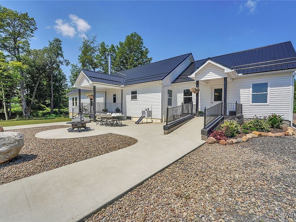Welcome to peaceful country living Amish Home on over 6 scenic acres. This beautifully built one-year-old ranch home. Offering over 2,000 square feet of living space, this home sits on a full walk-out basement constructed with energy-efficient Fox Blocks (insulated concrete forms). The main level features an open-concept layout with an Elm wood kitchen with eat in dining and flowing to the living room, perfect for both everyday living and entertaining. You'll find two spacious bedrooms, one full bathroom, and a mudroom that provides direct access to the basement. Step outside to enjoy a low-maintenance side porch and concrete patio, views of your private horse pasture. The property includes a large 6 stall barn, with a lean ideal for garage, woodworking, or storage. The home is currently equipped with wood heat and propane lanterns for lighting, though the sellers are open to wiring the home for electricity. Vinyl siding, steel roof, and a peaceful rural setting, this property offers a rare opportunity to enjoy comfort, space, and quiet country charm. A walk-up attic unfinished for the option to finish for additional living space. This home is a perfect blend of function and efficiency. Tax record does not reflect full assessment yet since this is a brand new built home.