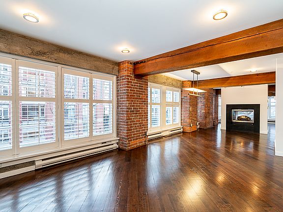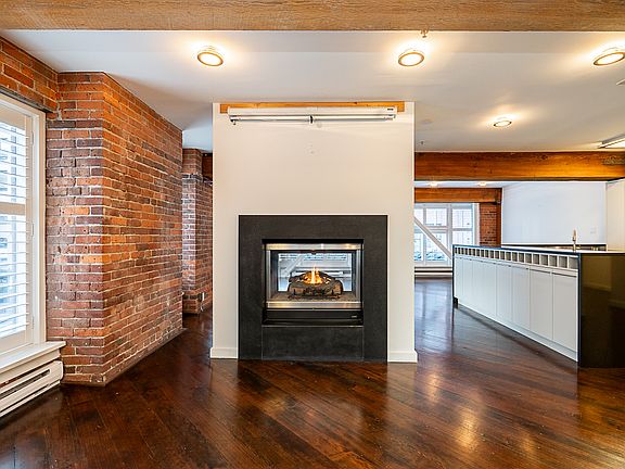 Inside, you'll find dramatic exposed brick walls, timber beams, and original wide-plank hardwood floors that set an authentic and inviting tone. The open-concept kitchen is equipped with stainless steel appliances, a gas range, and maple cabinetry, offering both style and functionality. The spacious living and dining area is centered around a double-sided stone gas fireplace, creating a warm atmosphere ideal for both quiet evenings and elegant entertaining.