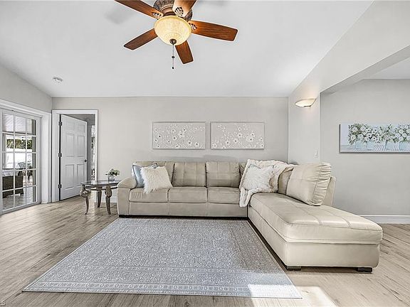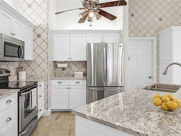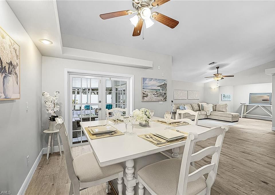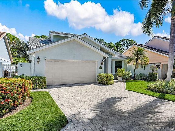 Welcome to this stunning, open, move-in-ready, single-family home, which lives like a 3 bedroom 2 full bath! Envision entertaining in the expansive great room, tasteful bar area, & beautiful kitchen with granite countertops, stainless steel appliances & custom cabinets. Experience the high vaulted ceilings, continuous plank, wood-style tile flooring & plantation shutters throughout. Notice the six ceiling fans, skylight & bay windows, providing an abundance of natural light and airy feel. Step through one of the six charming French doors onto a spacious lanai, where you can unwind in your private oasis and screened-in outdoor area. Relax in the master suite retreat, encompassing a roomy bedroom, en-suite bathroom & three closets, including a walk-in. Relish the two additional bedrooms & full bathroom, ensuring privacy for both residents and guests. Picture the coastal foyer, central vacuum system & 2-car garage with ample storage, washer/dryer & utility sink, rounding out this wonderful home. Imagine the serene, flower-filled, landscaped lot, with the back & sides gated and enclosed by privacy walls. Note: Internet, Cable, Lawn Maintenance, access to the community pool, tennis & pickleball courts are included in the Low HOA fees. A new HVAC (2024), washing machine (2025), & newer roof (2017) are just a few of the improvements, giving you peace of mind for years to come. Explore this prime Naples location, just a short drive to the beautiful Gulf beaches, shopping, restaurants & vibrant Downtown. This is a gem you don't want to miss.