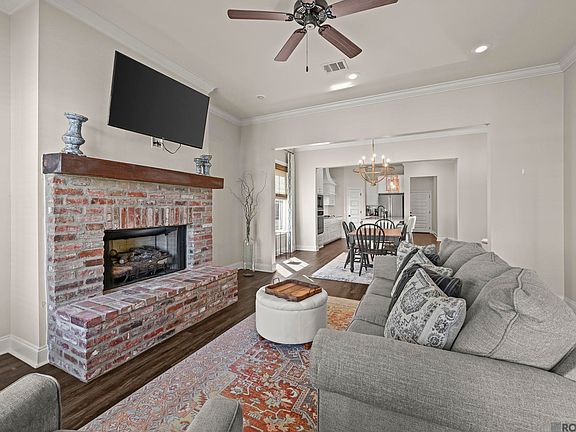 Located in the heart of Americana Subdivision, this Huntington A floor plan offers a great combination of comfort, function, and curb appeal. The home’s classic Southern architecture, inviting front porch, and thoughtful layout make it an easy fit for everyday living. Inside, the open floor plan connects the living room, dining area, and kitchen, creating a bright and comfortable space for gathering. The living room features plantation shutters and a brick fireplace that adds warmth and character to the space. The kitchen is both stylish and functional, offering granite countertops, stainless appliances, a large center island with seating, ample cabinet and pantry storage, and a pearl tile backsplash that adds a touch of elegance. The primary suite is privately positioned at the rear of the home and includes a spacious ensuite bath with dual vanities, a soaking tub, separate shower, and a walk-in closet. Two additional bedrooms and a full guest bath are located on the opposite side of the home, providing privacy and versatility for guests or family. Additional highlights include a tankless water heater and a covered rear patio that extends the living space outdoors. Within walking distance to restaurants, the YMCA, community park, and walking trail. Come see what life in Americana is all about!