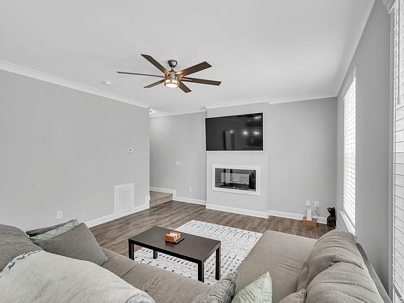 This Modern Farmhouse style home offers an open floor plan with large living spaces and modern lighting fixtures throughout. Great curb appeal with four over four grid windows, gray stone, black gutters, and column accents, a back deck, and a grilling patio. This home is situated on a lot which allows for no neighbor to the left (dining room side), is near the pool, and has a tree buffer at the large backyard. The inviting Foyer is large enough for a wall mounted drop zone, and just LOOK at that spacious Dining room with modern lighting fixture and plenty of room for a buffet or hutch. The dining room effortlessly flows to the kitchen with its white cabinetry, granite countertops, and stainless-steel appliances, and your window above the kitchen sink is great for overlooking your private back porch and yard. The large eat-at center island with granite countertops and island pendants is a complement to that perfect breakfast area. You will love preparing gourmet meals in this beautiful kitchen while overlooking the large great room with that stunning modern electric fireplace, and just look at those large windows, perfect for natural lighting. A nice size half bath is conveniently tucked under the stairway too! The home's 3 bedrooms, including the master suite, are upstairs, great for keeping little ones close. The spacious master suite has a huge walk-in closet with California style closet system, and full bathroom with double sink vanity, a fully tiled shower, and separate water closet. The other 2 large secondary bedrooms have a full bathroom nearby. There is also a flex room that could make a 4th bedroom, or a great office space! Great Duncan location with close access to HWY 29, HWY 85, dining, shopping and more! Listing agent is related to the seller.