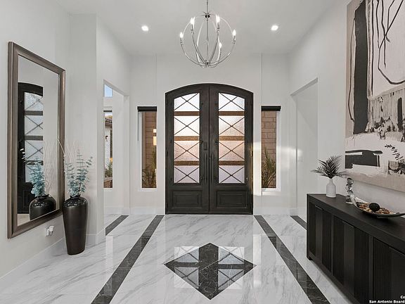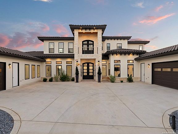 Experience the pinnacle of Hill Country luxury in this breathtaking custom residence, located in the prestigious gated community of The Peninsula at Mystic Shores. Set atop a private 3.62-acre hilltop lot, this immaculate two-story home blends modern elegance with comfort and functionality, offering stunning panoramic views of the Hill Country and Guadalupe River. Step through a grand 9-foot double iron door into an open-concept floor plan designed to impress. Soaring 22-foot ceilings and a massive sliding glass door flood the living space with natural light while showcasing the tranquil scenery outside. The living room features a striking floor-to-ceiling porcelain tile fireplace, adding a sleek and sophisticated focal point to the heart of the home. Custom ceiling designs throughout the home further elevate the architectural detail and aesthetic appeal. Perfect for entertaining, the gourmet kitchen boasts a massive center island, high-end Thermador stainless steel appliances-including a professional gas cooktop and vent hood-custom cabinetry with ample storage, quartz countertops, a large pantry, and an undermount sink. The luxurious primary suite offers oversized picture windows that frame daily sunsets and breathtaking views. The spa-inspired en-suite bathroom features an expansive walk-in shower with dual rain showerheads, 12 body jets, floor-to-ceiling porcelain tile, and a stand-alone soaking tub separated by a tiled pony wall. Dual vanities, a dedicated makeup station, and a generous walk-in closet complete this elegant retreat. Four additional bedrooms each include walk-in closets and private en-suite bathrooms. A dedicated office space opens to the patio via a sleek sliding glass door, while the upstairs loft and media room provide additional room for relaxation or entertainment. Enjoy outdoor living at its finest with both a covered patio and upper balcony offering uninterrupted Hill Country views. The full outdoor kitchen is ideal for al fresco dining and entertaining. Additional features include a spacious 3-car garage, high-end water softener system, a WiFi-controlled irrigation system, and tankless water heater providing endless hot water. Mystic Shores residents enjoy exclusive amenities including a lakeside pool, sports courts, playground, pavilion, and private access to Canyon Lake. With close proximity to Hwy 281, San Antonio, New Braunfels, and Wimberley, this home offers an unmatched combination of luxury, privacy, and convenience.