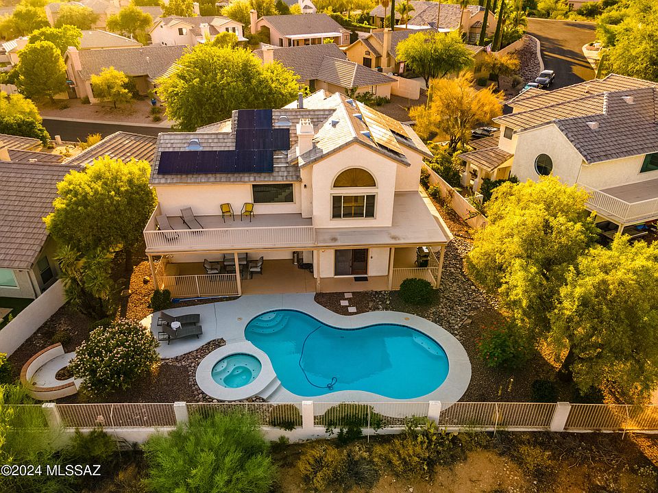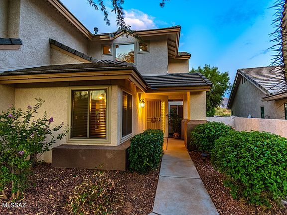 This amazing 2-story contemporary, 3 bedroom, 3 bath home is perfectly situated with an East-West orientation with the rear-facing the majestic Catalinas and the 5th hole of the El Conquistador La Canada Golf course, and bam from the moment you walk in it's your face! One could sit and appreciate the majestic views for hours. The only thing between you and its serenity is a freshly replastered, tiled, heated pool and spa with a water feature within a thoughtfully landscaped and hardscaped yard. The natural wood firepit and built-in seating for romantic evenings or entertaining enjoyment. If that weren't enough to keep you and your guests entertained there is a large 2nd floor balcony off the primary bedroom and take in the captivating views while enjoying the stunning city lights of downtown to the south. This home is spacious and well appointed in an amazing 50 home neighborhood, perfectly located close to all your needs and desires. Between the floor plan and especially selected finishes of the great combination of timeless style and comfort to enjoy for many years to come. From it's vast 2 story main living area and stunning hard wood flooring on the staircase, reading nook/loft at the top, the upstairs hallway and partially through the Primary. Also, seperating the primary from the 2 other good sized bedrooms is a nice full sized bath. The primary speaks for itself, spacious with a contemporary gas fireplace, great gallery windows with plantation shutters and the tasteful primary ensuite that has amazing closet space behind every modern full size mirrored door. Back downstairs is a full bath, and designated office that could easily be converted into a downstairs bedroom by adding a closet for anyone who may have difficulties with stairs. amazing 2 story main living area and family room space off the kitchen with gas fireplace so that everyone has their own privacy, space and place to nestle. The laundry room doubles as a butler's pantry with extra storage off the kitchen and on the way out to the 3 car garage. To top it off is the minimal electric bills relieved from the leased solar on the roof.