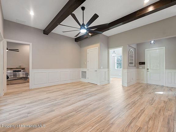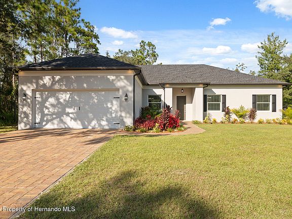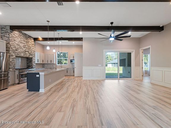 One or more photo(s) has been virtually staged. This stunning 3-bedroom, 3.5-bathroom home with a 2-car garage sits on a beautifully landscaped oversized corner lot, offering both privacy and elegance. The property features a split floor plan and an open layout with luxury vinyl flooring throughout. The primary suite includes two spacious walk-in closets and an elegant en-suite bathroom with a double vanity, a step-in shower with floor-to-ceiling calming gray tile, a private water closet, a separate soaking tub, a built-in wall niche, and a window for natural light. The additional bedrooms each include walk-in closets and private en-suite bathrooms with tub/shower combinations, and all three full bathrooms feature state-of-the-art LED vanity mirrors with touch controls and luxurious floor-to-ceiling tile. The open-concept kitchen and living area offer both comfort and style, highlighted by wooden ceiling beams, solid wood cabinets, stone countertops, and picture frame wainscoting in the living and dining rooms. The gourmet kitchen features two gas ranges framed by a stunning stone wall and upscale white tile backsplash, stainless steel appliances, granite counters, and two sinks—one in the island/breakfast bar and another beneath a window with beautiful outdoor views—along with a large walk-in pantry and contemporary two-tone cabinetry in light and dark grays. The living room opens through sliding glass doors to a spacious rear covered porch overlooking a peaceful yard surrounded by oak trees and natural woodlands, and a versatile office off the living room can also serve as a fourth bedroom. The laundry room includes a closet, storage shelving, sink, and convenient corridor access, while additional highlights include high ceilings, double-pane Energy Star-qualified windows with impact and thermal glass, a fuel tank, and a full irrigation system. Current homeowner have maintained an insurance policy with a reasonable premium. and no flood insurance is required as the property is not located in a flood zone. This home offers a rare blend of elegance, comfort, and privacy while remaining close to Weeki Wachee Springs, Hernando Beach waterfront dining, and Brooksville Country Club, making it the perfect balance of modern living and Florida natural charm.