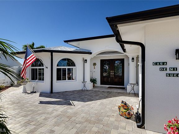 Absolutely stunning property! From the polished travertine throughout the entire home, modern upscale furniture-grade cabinets (Thomasville) with an incredible amount of storage, to the unmatched phenomenal sunsets every night---from your pristine pool if you'd like! THIS is the island home we dream of! The kitchen boasts gorgeous, white Cambria quartz, including a huge island with spectacular waterfall design that's seen the moment you walk in the door. All appliances are new GE Profile and the microwave utilizes Advantium technology making it dual purpose as a second wall oven as well. Bathrooms have been beautifully upgraded and all windows feature custom blinds, some electric. The resort-style pool has an integrated spa at one end and an integrated water feature at the other, with unobstructed views across the bay! The entire home is concrete block and secure with impact windows and doors, and would be a perfect candidate for flood panels----the home flooded minimally and was professionally remediated. Solar panels allow for year around average electric bills of $110 with credits enrolled in the LCEC Net Metering Program. New AC and an additional mini-split system in the garage expand your ability to "project through all seasons" as well in the oversized garage. Priced to sell, this home is a must-see.