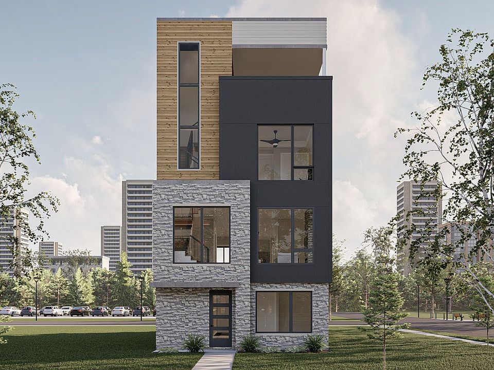 Proposed construction by Embarq Signature Homes featuring the Amara plan, a freestanding, detached single-family home in Gray’s Station with stunning downtown Des Moines views from a full-sized rooftop terrace. This contemporary design offers four levels of living space with elevator access to every floor and the ability to customize interior finishes to suit your lifestyle. The home includes 3 bedrooms, 3 full bathrooms, 2 half baths, and approximately 3,203 square feet of living space. The first floor offers a spacious garage, flex room or bedroom, drop zone, and full bath. The second floor features an open-concept kitchen with island, dining area, living room, pantry, and covered deck. The third floor includes an owner’s suite with walk-in closet and spa-like bath, and an additional bedrooms, full bath, and laundry. The penthouse level provides an entertainment space with wet bar, powder room, and access to the rooftop deck and patio. Exterior finishes include cement and cedar siding with abundant natural light from windows on all four sides. Located in downtown Des Moines’ newest neighborhood, Gray’s Station, this home combines modern architecture with walkable urban living. Contact the listing agent for details on how to get started building your dream home today.