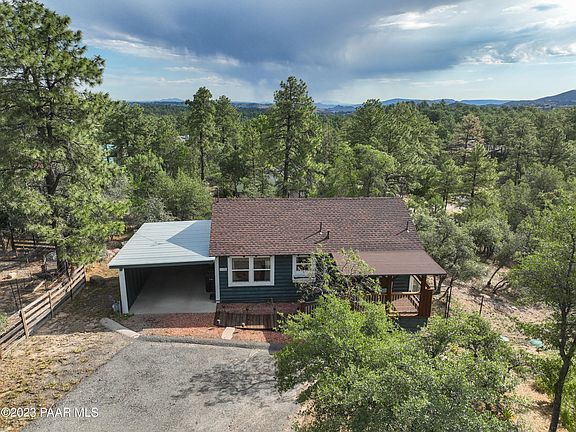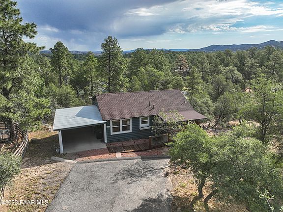 Don't miss this lovely cabin in the pines. Less than 2 miles from downtown and paved roads all the way to the property. The home sits at the end of a cul-de-sac and has more than a 1/3 of an acre of land which is fenced for pets. The wonderfully refreshed home has a cozy fireplace, mini split for heating and cooling, and a great kitchen just large enough to cook and entertain. The vaulted ceiling in the living room gives it an open feeling and the views from every room make the cabin feel like a perfect home setting. 2 good sized bedrooms with 1.5 baths. Bedroom 2 does not have a closet, but an armoire can easily be added if you want one. There is a nice porch in the front of the home and a large private covered deck in the back with lots of room and views of the trees.