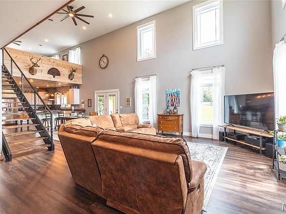 This one-of-a-kind property has it all—spacious living, high-end finishes & room to roam on 11 beautiful acres featuring open meadows & tree-lined privacy. Step inside to discover a grand living room with soaring 18-foot ceilings & an abundance of windows that flood the space with natural light. The open floor plan flows seamlessly into a chef’s dream kitchen, complete with a professional-grade propane Viking range, ample counter space & custom cabinetry—perfect for entertaining or everyday luxury. The expansive main-level master suite is a true retreat, offering plenty of space & comfort. A dedicated home office provides the ideal space for remote work or quiet productivity. Upstairs, a versatile loft area offers additional space for relaxation, hobbies, or a playroom. In addition to the main living area, the home features a massive 900 sq ft attached garage that is both heated & cooled—ideal for vehicles, storage, or a workshop. You'll also find a separate 2,000 sq ft shop, fully heated & cooled, offering endless possibilities for hobbies, business use or equipment storage. Additional features include a zoned HVAC system for energy efficiency, a backup generator hookup for peace of mind & a layout designed for comfort & function. Outside, enjoy the serenity of your private acreage—perfect for gardening, recreation, or simply soaking in the quiet natural beauty. This is a rare opportunity to own a luxury home with exceptional amenities & acreage—your private retreat awaits!