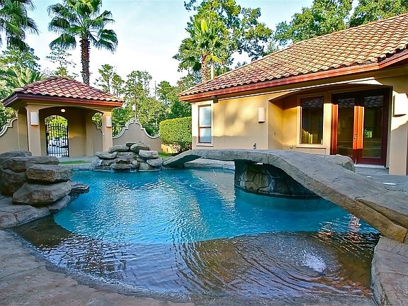 Magnificent custom 1 story on a 2 acre greenbelt lot in White Oak Estates! Travertine, built-ins, crown moulding, decorative arches & more! Gourmet isl kitch w/granite, custom cabinets, breakfast bar & ss apps opens to breakfast; formal dining w/tray ceiling, master suite w/sitting area, FP, walk-in cedar closet; luxurious bath w/FP, tub, glass brick dbl shower & seated vanity, gameroom w/granite wet bar & stone FP; stunning heated pool/spa/waterfall, summer kitch, casita w/bedroom & full bath.