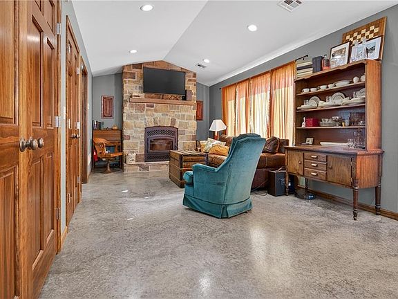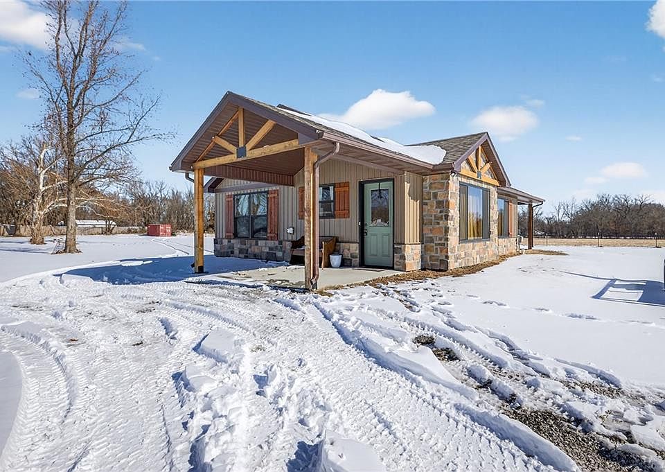 Set on a peaceful 9+ acre tract, this 2024 cabin-style build blends modern comfort with rustic charm. Approximately 7.5 acres are fully fenced, while an additional 2 acres remain open, offering flexibility for recreation, animals, or future use. The 850 sq ft, all-electric home sits on a full slab foundation and features an efficient, thoughtfully designed layout with two non conforming bedrooms, each with its own private bathroom. Inside, enjoy a cozy fireplace, all new appliances and systems, and a washer/dryer included for true move-in ease. One bathroom showcases a striking full rock tiled walk in shower, adding a spa-like touch to the cabin aesthetic. Step outside to the 10x25 covered back patio, perfectly positioned for relaxing or entertaining, complete with a hot tub overlooking the surrounding acreage. Whether you're seeking a weekend retreat, short-term rental opportunity, or a quiet full-time escape, this property delivers privacy, modern finishes, and wide-open space in a truly turnkey package.
