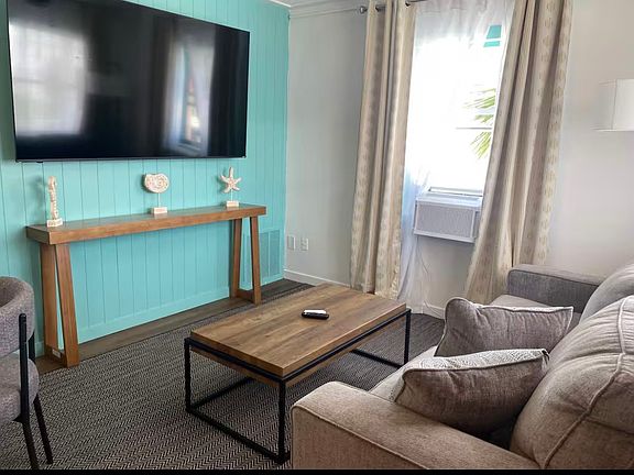 Modern Living Area: The open concept living room is anchored by a sleek sofa bed, flat-screen TV, and stylish wood-and-metal coffee table, creating a perfect spot for movie nights or lounging after the beach.