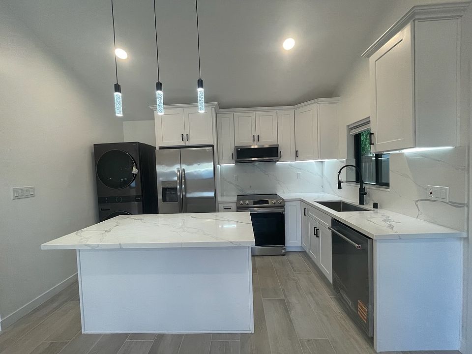 Sleek kitchen with full-size stainless steel appliances, under-cabinet lighting, and a center island with modern pendant lights