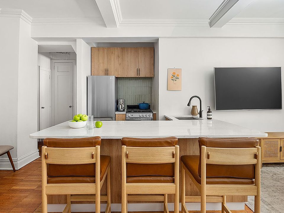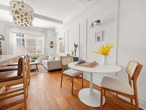 Thoughtfully renovated, the apartment features a new kitchen and bath, as well as beautifully restored architectural details including beamed ceilings, original oak parquet floors, elegant crown and picture-frame moldings, and new six-foot-wide casement windows with marble sills and custom blinds.