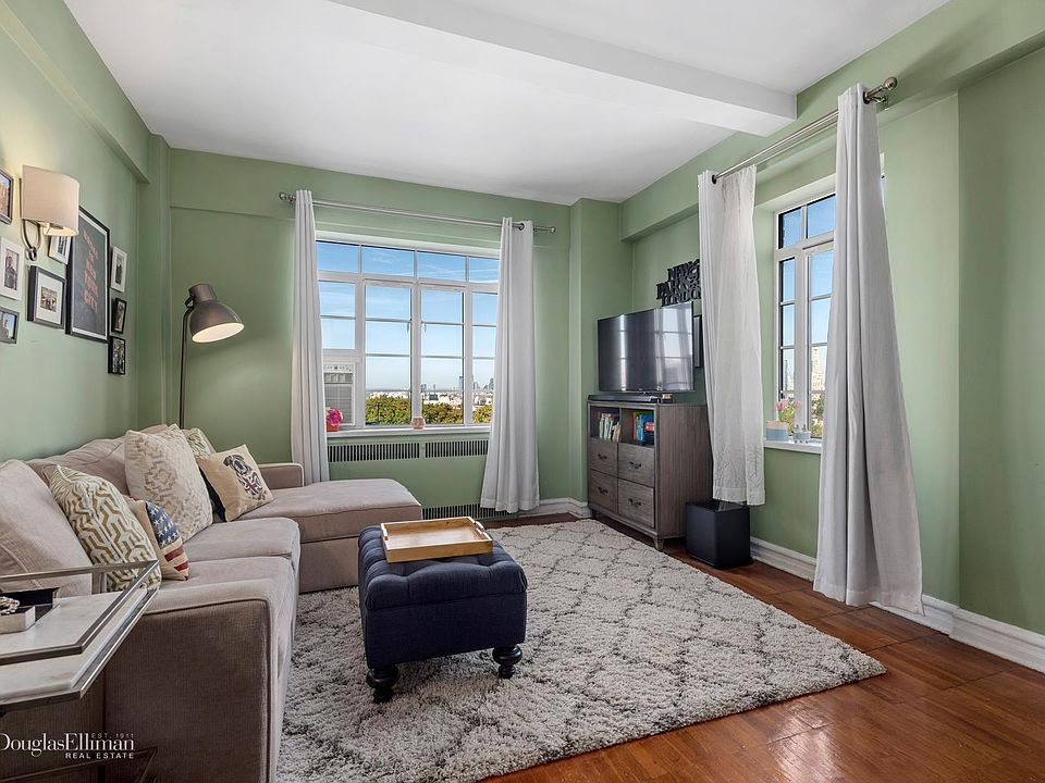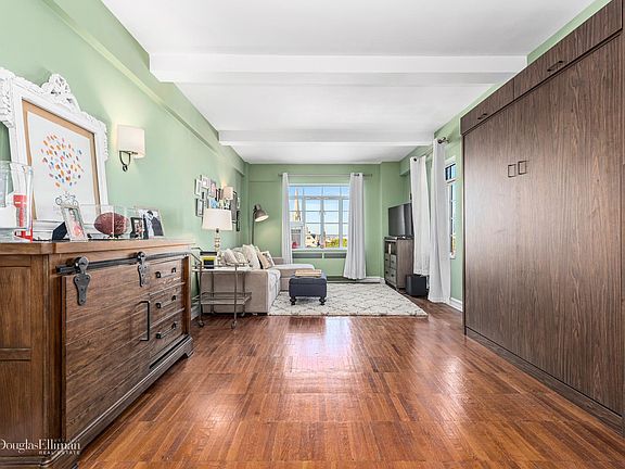 Showstopper views and tons of charm! This rarely available corner D-line at 118 8th Avenue is an expansive one bedroom with 9' beamed ceilings, oversized casement windows, and spectacular western and northern views of downtown Manhattan, spanning all the way from the Statue of Liberty to the Empire State building. Enter into the gracious living and dining area with two windows and double exposures providing abundant light and gorgeous views over Brooklyn all the way to Manhattan. The current owners have installed a custom Murphy bed which is great for overnight guests while still leaving plenty of space for a dining table. Need a home office too? The separate foyer area features floor to ceiling bookcases and has space for a desk. Down the hallway, enter the charming eat-in kitchen with plenty of cabinet space and shelves for storage, a Smeg fridge, Bosch dishwasher, and another window. The extra large corner bedroom also features two windows with double exposures and fabulous views, allowing you to watch beautiful sunsets over Manhattan. There is a large closet outfitted by California closets as well. In addition to a bed and dresser, there is enough space for a home office, crib, or dressing area, whatever your space needs may be. Finally, the subway tiled black and white bathroom offers a pedestal sink, large bathtub, medicine cabinet, and a window. There is abundant storage throughout the apartment including two large closets in the entryway and a linen closet in the hallway. Located at the corner of 8th Avenue and Carroll Street, just one block from Prospect Park, 118 8th Avenue is a gorgeous, Landmarked co-op offering a doorman, live-in super, laundry room, gym, storage (waitlist) and bike storage. Convenient to multiple transportation options and all that Park Slope and Brooklyn have to offer! Contact us today for a private showing and make this fabulous apartment your next home!
