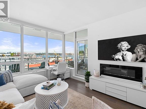 Ocean views and prime Shipyards location! The Promenade by the award-winning Polygon. Offering bright & spacious 868 square foot 2 bedroom, 2 bathroom sub-penthouse home with open layout, bright kitchen, separated bedrooms and AIR CONDITIONING. Enjoy ocean views year-round from the oversized covered patio with a gas hookup for a barbecue. Luxury finishings in this space including hardwood, a gourmet kitchen with integrated appliances, and a spa-inspired master ensuite with a rain shower. Insuite laundry, electric fireplace, one storage locker and one secured parking spot included. The building is six years old, and the suite is freshly painted with new carpets. Two pets allowed. Pictured with furniture, but it comes unfurnished. Situated across from Lonsdale Quay, steps away from the Shipyards, dining, shopping, seabus terminal and bus hub, Spirit Trail, and the John Braithwaite Community Centre. Building amenities: fitness center, dog wash station, concierge, billiard lounge. This location cannot be beat! Available now.