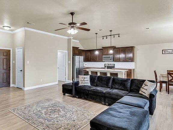 Extended sunny backyard patioStainless steel appliancesCeiling fansDesigner upgradesBeautiful counter-height islandWood cabinetsPendant lighting
