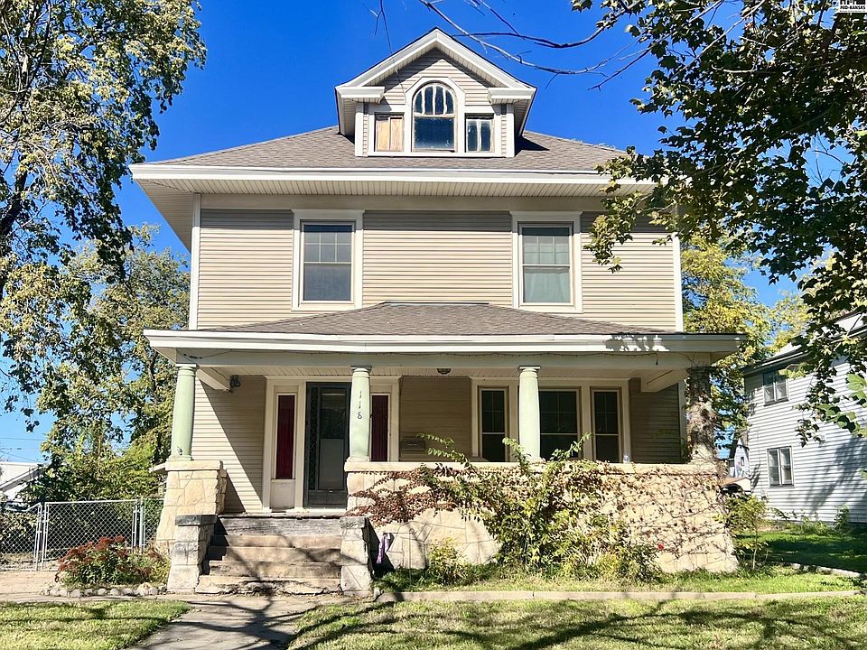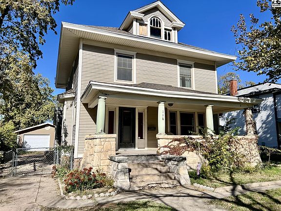 Full of character and potential, this stately 2-story home offers 5 bedrooms, 2.5 baths, and over 2,200 sq ft of living space. Built in 1912, it showcases timeless architectural details — from the grand covered front porch with columns to the beautiful woodwork and hardwood floors found throughout. Inside, you’ll find two living areas, tall ceilings, and plenty of room to personalize and make your own. The layout provides flexibility for bedrooms, home office, or hobby spaces. Outside, the property includes a spacious 4-car detached garage, perfect for vehicles, storage, or a workshop. With its solid structure and classic charm, this home is ready for your updates and finishing touches to truly make it shine. This home is being sold as-is and offers a fantastic opportunity to restore and update a true piece of Hutchinson history.