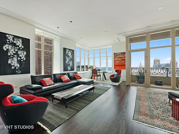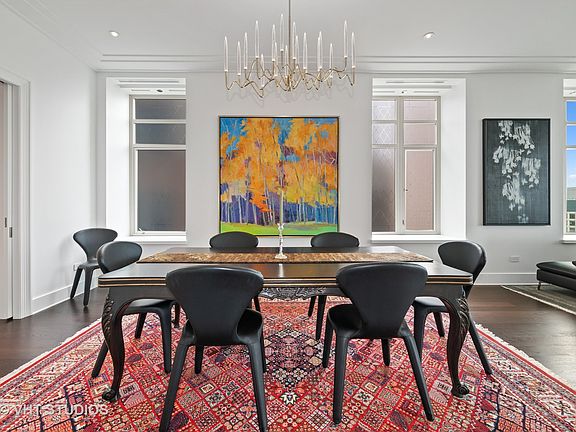 This light-filled, 3661 SF, three-bedroom plus den home at The Ritz-Carlton Residences lives like a single-family home and offers stunning east, north and west views of the lake, skyline & Michigan Avenue. The impressive residence welcomes with a semi-private elevator foyer, 11' ceilings with huge windows, expansive open living room/dining room, three ensuite bedrooms, 3.1 baths, den, fabulous storage and two lovely terraces with views. Gracious, detailed archways and moldings give the feeling of a vintage condominium designed for a contemporary lifestyle. The DeGiulio chef's kitchen features a smart built-in breakfast bar, SieMatic cabinetry, natural stone countertops, wine storage, Wolf, Sub Zero & Miele appliances. Spacious baths have all natural finishes with Waterworks plumbing fixtures, natural stone countertops & limestone floors. The thoughtfully-designed, large custom closets throughout the home are an organizer's dream. Custom lighting and motorized shades add to the beauty of the home and ease of living.The Ritz Residences building is renowned for its unparalleled level of service, five-star amenities, exquisite design details, privacy and luxurious spaces that expand residents' living space. Enjoy the Landmark Club with a stunning Gary Lee designed salon, private dining and meeting space, daily beverage service and expresso bar, fitness center, billiards lounge, terrace, spa treatment/relaxation rooms & screening room. The ultimate lifestyle awaits: full concierge service, butler & wine storage. Valet parking available for $75K.