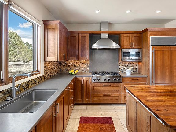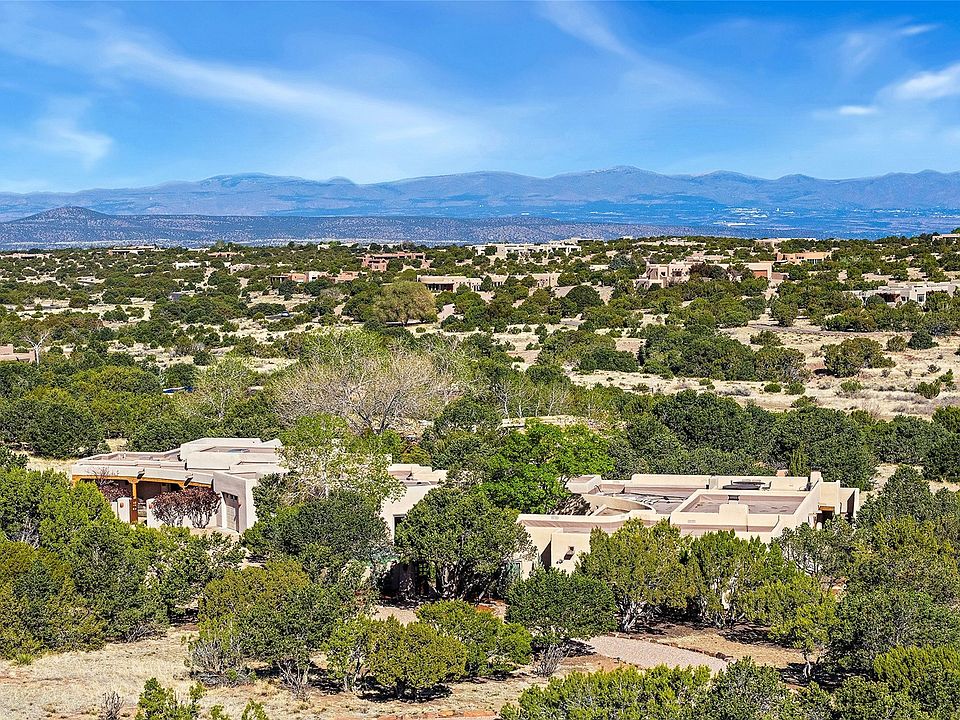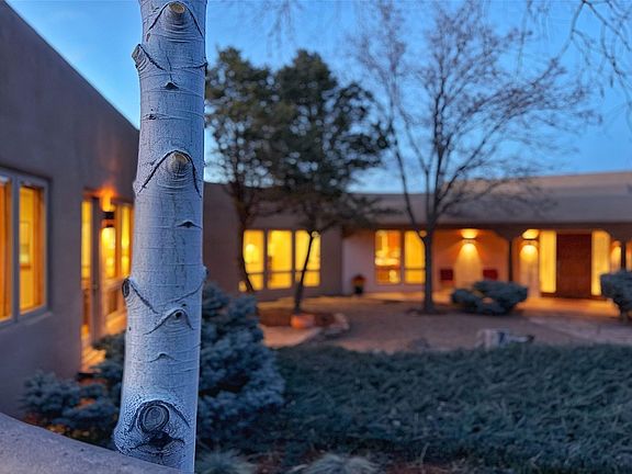 Views, comfort and privacy, this luxury offering has all the feels, soft and round and colors and materials that are embracing and relaxing. The perfect takeoff spot for everything Santa Fe has to offer. The main house has three ensuite bedrooms plus a den, office, and the attached casita has two ensuite bedrooms. On 1.5 acres in highly desirable, gated, conveniently located, Salva Tierra in northwest Santa Fe. Built around a walled circular courtyard which forms a connecting crescent gallery inside with georgous, curved plaster walls, travertine floors, high viga and plank ceilings, custom cabinets and doors, walls of windows, portals, two patios, outdoor dining areas, and a star drenched rooftop hot tub with magnificent Jemez and Sangre mountain views. The great room features high ceilings with vigas, a grand fireplace, abundant light, and large picture windows. The primary suite has it’s own fireplace, a flex area, a large walk in closet, walk in shower and a spa like tub with a view. The chef’s kitchens in both houses feature Wolf ranges, Subzero refrigerators, Dacor double ovens, large islands, a breakfast area and easy access to outdoor patio dining. The main house has a separate office that looks on to the courtyard. The attached guest casita mirrors the main house’s finishes blending the two units seamlessly. The casita is perfect for family and friends, care takers, etc. Two fountains, a three car garage, six parking spaces, a Generac natural gas back up generator large enough to power the entire house, Lochinvar high efficiency tankless boiler, radiant floor heat with Wirzbo PEX tubing, mini splits, five fireplaces, electric shades, on a single level with minimal interior steps, security system, fenced yard, new stucco, new TPO roof with warranty, community tennis and pickleball courts, nearby hiking/walking/biking trails. A friendly HOA keeps the private roads great for walking. The Club at Las Campanas is close by, downtown and the Santa Fe Plaza is a short drive! Near Arroyo Vino restaurant, and across from the local fire station on Camino La Tierra. Presale Inspection performed, repairs meticulously made, move in ready to perfection! Watch the video, take the virtual tour.