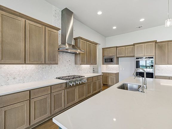 Steps to Treehouse Amenity Center! Backyard privacy- no backing neighbor. Full covered front porch and oversized covered back patio with stained T&G wood ceiling. Massive dual 8' iron and glass front doors. 2 car and separate 1 car garage- perfect for guests, toys, or additional storage! 8' insulated exterior garage doors and smart openers. All garages offer direct access to the main house. Expansive kitchen with 10' kitchen island and natural gas stainless steel appliances. 36" KitchenAid commercial style range top with 6 burners and a chimney vent hood. Primary bath features dual vanities, framed mirrors, dual shower heads, freestanding tub and mudset shower. Large flex room on first floor- perfect for a study or playroom! Home is built with Zip Board sheathing, hurricane straps for secure roof, and spray foam insulation for a better long term investment and energy savings!
