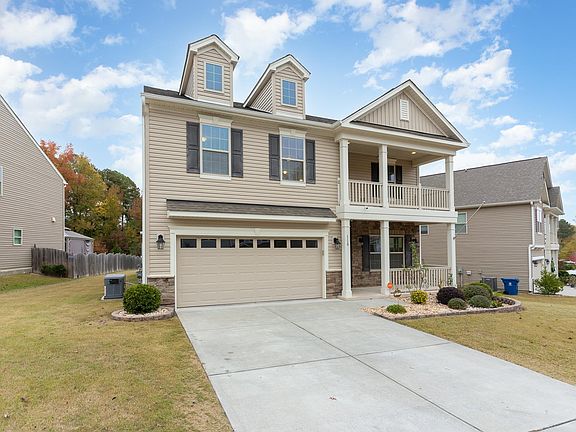Spacious, open floor plan with a large living room and kitchen featuring beautiful granite countertops, wooden cabinetry, and has stainless steel appliances. Super upgrades include whole-house generator, tankless water heater, designated grill gas line and air purifier. 1st Floor BR and BA making an ideal space for guests. The upstairs offers 4 bedrooms, including the primary suite with a luxurious en-suite bathroom. Three covered porches and a patio! Close to Hwy 70 and 98 providing easy access to retail, restaurants, hospitals, Falls Lake, and more! Click the Virtual Tour link to view the 3D walkthrough.