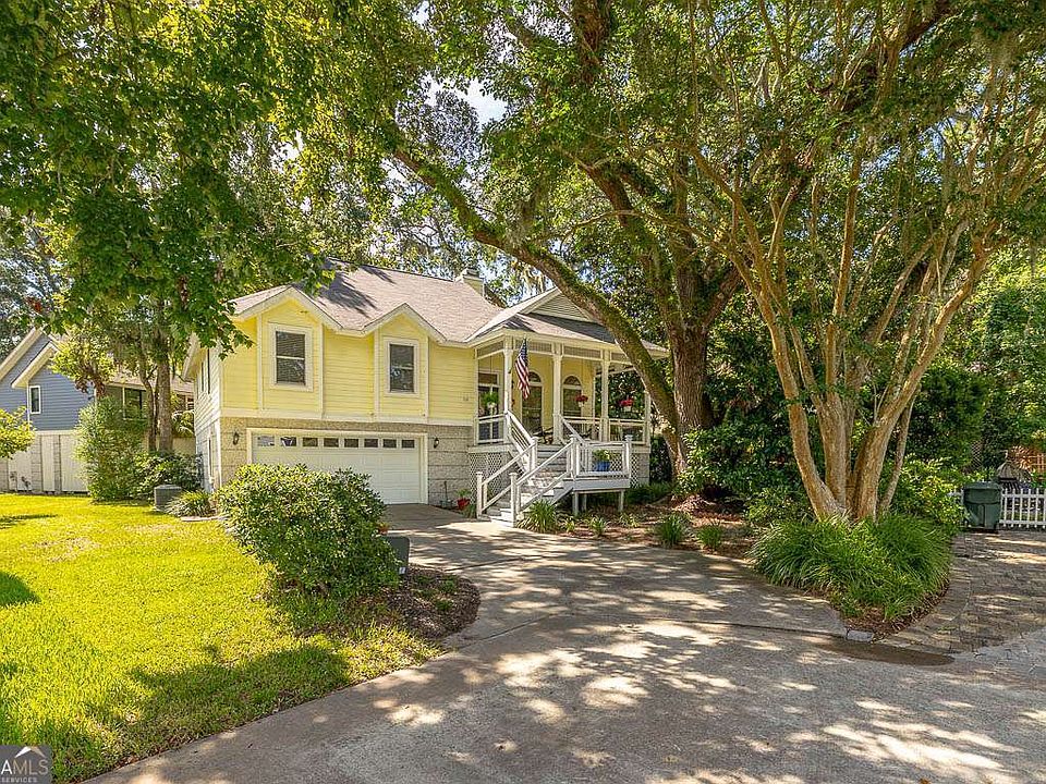Motivated sellers, priced to sell! Welcome to this island cottage, just a stone's throw from the beach-only a mile away! Tucked away at the end of a peaceful cul-de-sac, this lovingly cared for coastal home is full of charm. From the moment you step inside, you'll feel the easy, coastal vibe, featuring a vaulted great room with a cozy wood-burning fireplace, a cheerful dining area, and a spacious kitchen outfitted with breakfast area. Enjoy your morning coffee or evening cocktail in the sunroom just off the kitchen-or kick back on the covered front porch overlooking a lagoon with fountain. Parquet flooring and a fun multi-level layout. The spacious primary suite is tucked away for a little peace and quiet, complete with walk-in closet, and an updated bathroom with huge shower. Two more light-filled bedrooms and a shared hall bath make guests or family feel right at home. Downstairs, the garage level offers even more space to relax and enjoy, whether you turn it into a game room, extra bedroom, or the ultimate rec space. With plenty of storage, a two-car garage and all the charm you could ask for, this home is ideal as a full-time retreat or a part-time getaway. Come on in and stay awhile. The island life is calling!