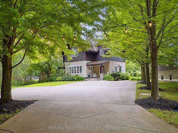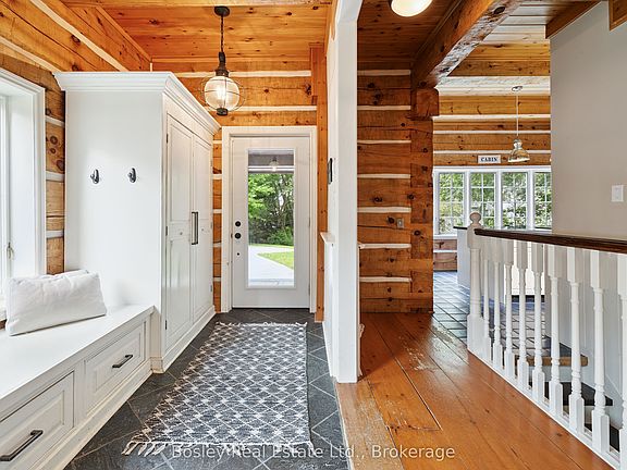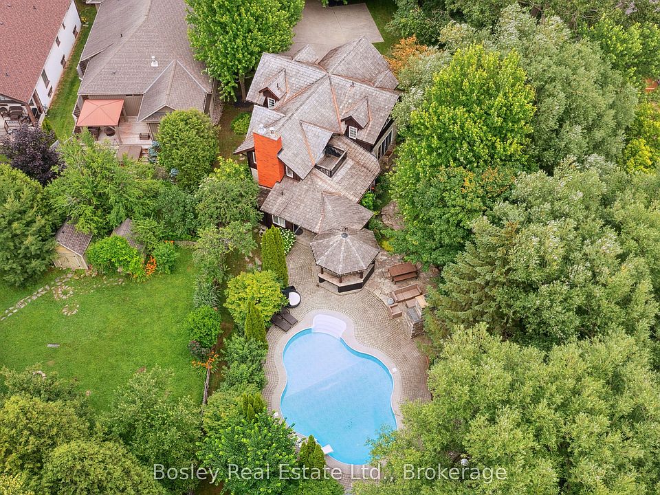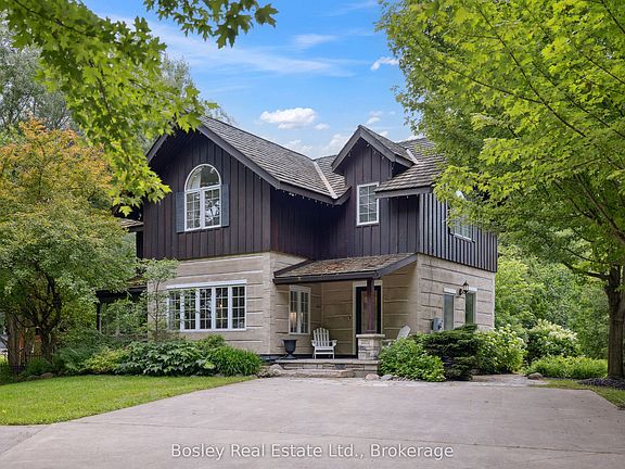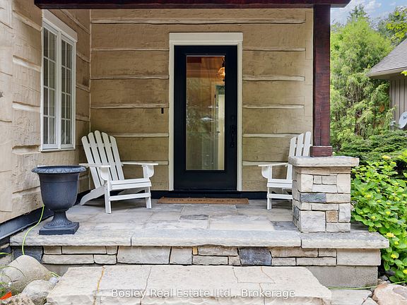 Exceptional 5-Bedroom Chalet on Nearly 1 Acre Near Blue Mountain Village. Set on an expansive, private lot just a short walk from Blue Mountain Village, this stunning 5-bedroom (4+1), 4.5-bath chalet offers the perfect blend of rustic charm and modern mountain luxury. Spanning nearly an acre and approximately 450 feet deep, the property features timeless log home architecture, custom finishes, and built-ins throughout.The bright, open-concept kitchen with quartz countertops flows seamlessly into a spacious dining area ideal for entertaining. Unwind in the cozy living room, complete with a fieldstone gas fireplace and custom soapstone wet bar. The primary suite is a true retreat with its wood-burning fireplace, spa-inspired ensuite, walk-in closet, and private balcony. The fully finished lower level expands your living space with a media room, home office, fifth bedroom, and full bath. Outside, enjoy a resort-style backyard featuring a free-form heated pool (heat pump 2023, heater 2019, liner 2018), a cabana with built-in BBQ, sink, and bar fridge, a charming bunkie, and a beautiful stone fireplace perfect for evening gatherings. Additional highlights include a refurbished cedar roof (2020), on-demand hot water, generator, and picturesque views of the ski hills. Originally built in 1990, this one-of-a-kind four-season home is nestled beside a serene stream and surrounded by mature trees - an ideal mountain escape for year-round enjoyment.