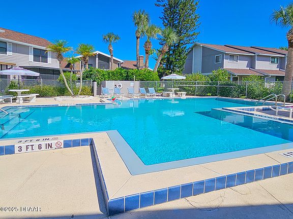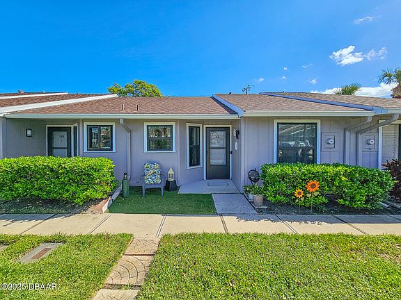 Nestled in the Heart of New Smyrna Beach, this charming 2-bedroom, 2-bath Villa has been beautifully updated and offers the perfect combination of coastal luxury and everyday convenience. Soaring cathedral ceilings and glassed French doors create a bright, open living space, while the renovated kitchen (2021) showcases quartz countertops and new cabinetry. The spacious primary suite features an en suite bathroom, vanity area and walk-in closet. Passing thru the French doors you'll relax in on your screened in porch, then step outside to a private paver patio and roll out awning—perfect for entertaining or relaxing. Enjoy resort-style amenities, including a sparkling community pool, clubhouse, and dock for waterfront fun. Additional recent upgrades include H2O Heater (2017), flooring (2020), new windows (2021), A/C (2017), and a new roof (2022) for peace of mind and worry-free living. If that's not enough, the villa has a 1-month rental minimum for income potential. Located off the North Causeway, your minutes from the beach, fishing, public boat ramps and walking distance (or a quick golf cart ride) to Flagler Ave and Canal Street's shops, dining, and entertainment as well as the beautiful beaches of the Atlantic Ocean. With designated parking and a prime location, this move-in-ready villa is a rare find in a sought-after neighborhood. Don't miss outschedule your showing today!