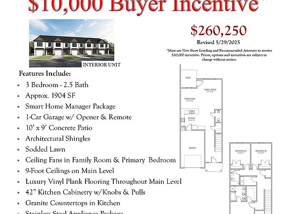 $10,000 Buyer Incentive with Recommended Lender. INTERIOR UNIT (4) in Pearson Commons Townhomes! 3 Bedroom - 2.5 Bath - Approx. 1904 SF - Smart Home Manager Package - 1-Car Garage w/ Opener & 1 Remote - 9' x 10' Concrete Patio - Architectural Shingles - Sodded Lawn - Ceiling Fans in Family Room & Primary Bedroom - 9-Foot Ceilings on Main Level - Luxury Vinyl Plank Flooring Throughout Main Level - Kitchen Features: 42" Kitchen Cabinetry w/ Knobs & Pulls, Granite Countertops & Stainless Steel Appliance Package. Quartz Vanities in All Full Baths - Double Sinks, Garden Tub & Separate Shower in Primary Bath. 1+8 Builders Warranty Included.