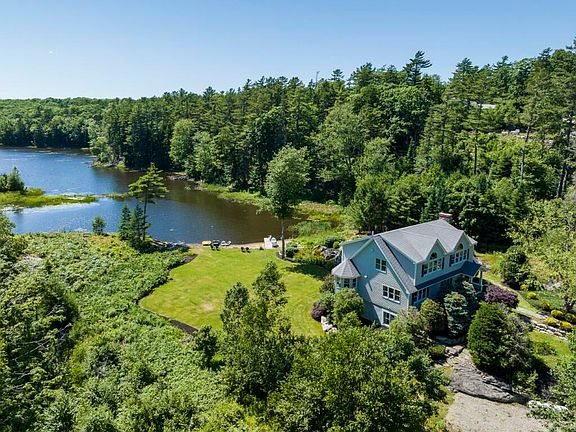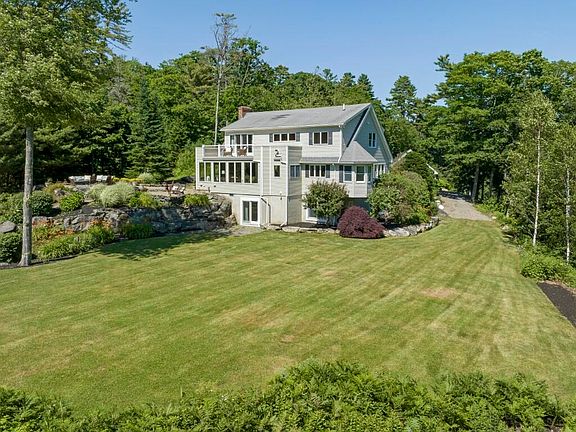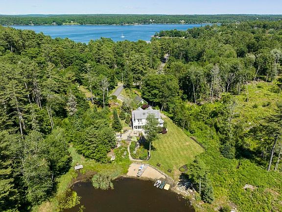 This contemporary cape has spectacular views and almost 400' of shorefront on the picturesque Meadow Pond. An unspoiled and undiscovered location on a quiet side road, this 3 bedroom, 2.5 bath home boasts a chef's custom kitchen with an exquisite finish and thoughtful details throughout. A spacious mahogany custom island with cabinetry, built by Scott Libby, is incredible for entertaining. In 2008, this home was completely upgraded and now takes advantage of the scenic view of the pond and the nature that abounds. Water views from all the rooms and incredible light all day long. Westerly views and sunsets on the pond and a gentle slope to the shore to enjoy fishing, kayaking, or paddleboarding. The Association dock on the Damariscotta River provides for oceanfront boating. A primary suite to be envious of, with a waterside deck, a wood burning fireplace, an attached studio/office space and walk-in closets and dressing area with more custom cabinetry. The level 2 acre lot is 5 minutes from Boothbay Harbor, a short walk to a marina or the general store and nearby Ocean Point is a short drive. Explore this unique setting in the immaculate home.