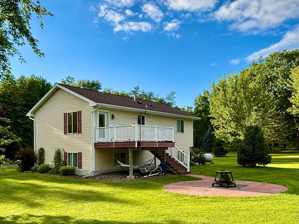 This 3 BR/2 BA home sits on a spacious .66-acre lot, featuring an open-concept layout with vaulted ceilings, large windows allowing an abundance of natural light, plenty of storage, and a 3 car attached garage. The spacious kitchen has a center island, open to the dining area, which walks out to a deck overlooking the backyard. Fully finished basement with a great family room, that could easily serve as a primary bedroom, a large bedroom, bathroom, and laundry/utility room. This nicely landscaped yard has a large circular patio, two raised and enclosed garden boxes, plenty of green space, all surrounded by a mixture of pine and maple trees making this a private and wonderful place to spend time.