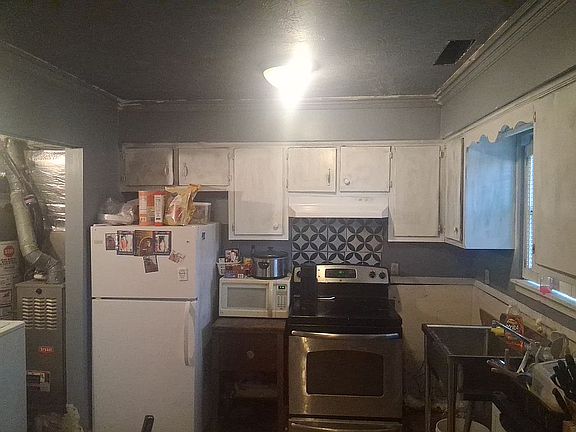 2 bedrooms 1and a half bathroom kitchen and living room fireplace. It would be a handy man special