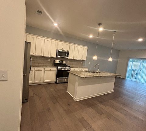 Recessed lightingOpen floor planKitchen islandGranite countertopsGas rangeStainless steel appliances