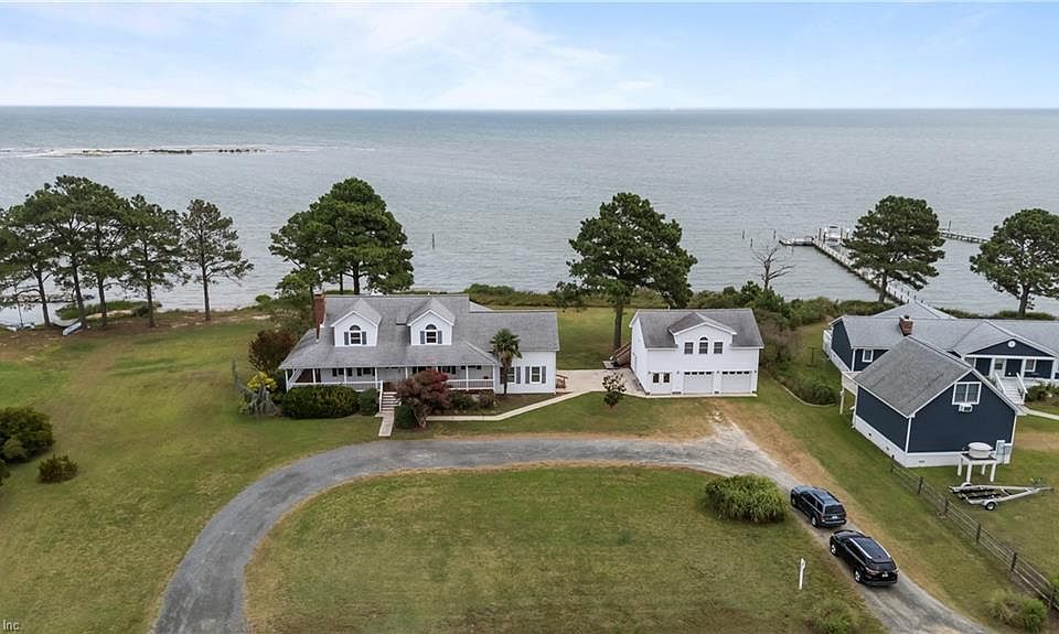 Chesapeake Bay, wide open complete waterfront views with protective low-profile island 1000 ft offshore located on 1.43 acres that includes a large deck, wraparound covered porch, sunroom, a private dock on navigable water and a detached 2 car garage featuring an apartment/in law-suite that is currently rented providing income potential. A rare opportunity to own versatile waterfront living with endless views and coastal charm!