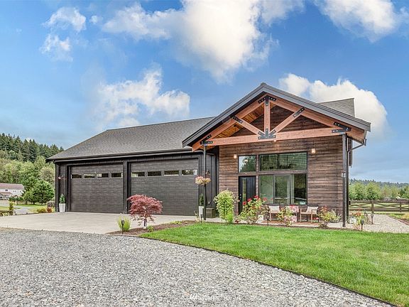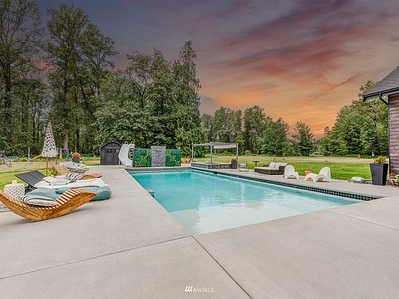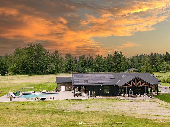 Custom 5097 sqft home on 19 acres of prime equestrian potential land along the Pilchuck River. The home comes with a 4 car garage, 5 bedrooms & 5 bathrooms. The primary suite is tucked away with two walk-in closets, a 5-piece bath and private door to the 45x20 inground pool & hot tub. The main area of the home is open and an entertainer's dream. You first notice the beautiful custom wood trusses & then you're drawn to the 22 ft island w/Granite countertops, high end appliances, Ilve range w/double oven, Miele plumbed espresso machine and a full-size pantry. 48 panel solar system w/Telsa battery pack, 2100 sqft 6 car shop w/attached home office/ADU possibilities. Two parcels 15acres/4.4acres w/an approved/current short plat on the 15 acres.