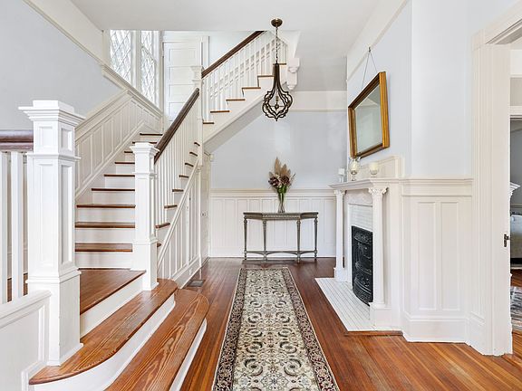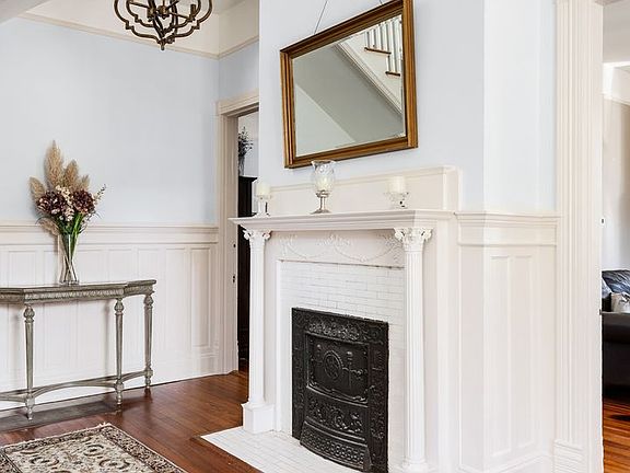 Step through the front door into a welcoming foyer filled with natural light, high ceilings, and a decorative fireplace that hints at the home's storied past. Just off the entryway is a formal sitting room with plush seating and views of Cannon Park- the perfect spot for morning coffee or conversation. Adjacent, the main living room provides a cozy gathering space with a comfortable sofa, decorative fireplace, and TV.